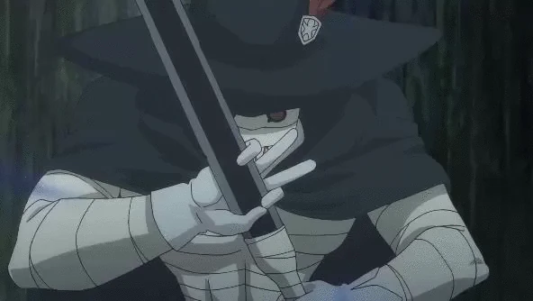 Grimm is a tall and lean man. He is wrapped from head to toe in white feather bandages that both heal and protect him and others. His face has red glasses on each eye and he has pointy teeth drawn on his mouth bandages. He wears a black pointy hat with a feather on it and a black cloak as well. He also wears a pair of black pants and white shoes. Plus he has a pair of white gloves with an eye drawn on it and he has a belt where he holds his storage scrolls with his weapons.